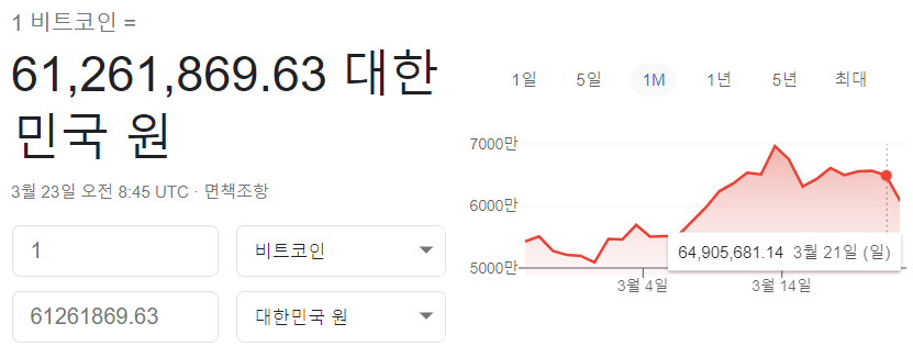 우리나라 돈으로는 1비트 코인에 6120만 원이네요... 후 ㄷㄷㄷㄷ....