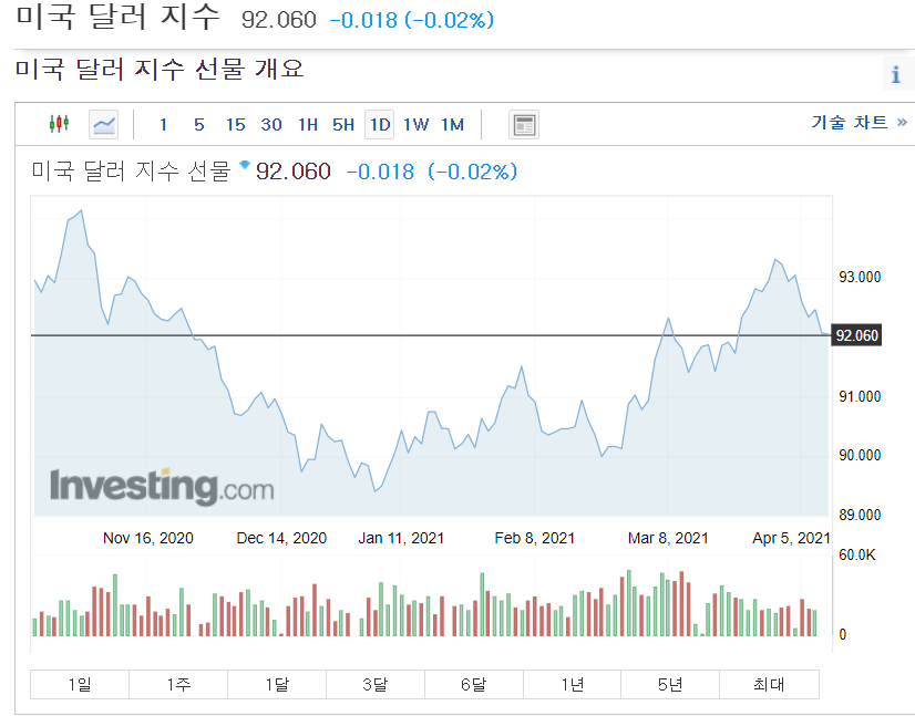 이번에도 2달간 나스닥 하락장에서 달러는 계속 상승하는 모습을 보여줬고, 3월 30일 달러지수가 93.35까지 올라갔다가 현재는 92.060까지 떨어진 모습을 볼 수 있습니다.