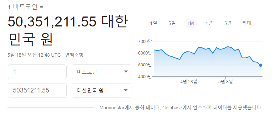 일론 머스크의 댓글 트위트 직후 비트코인 가격은 8%가량 하락했다가 현재 낙폭을 줄여가고 있습니다