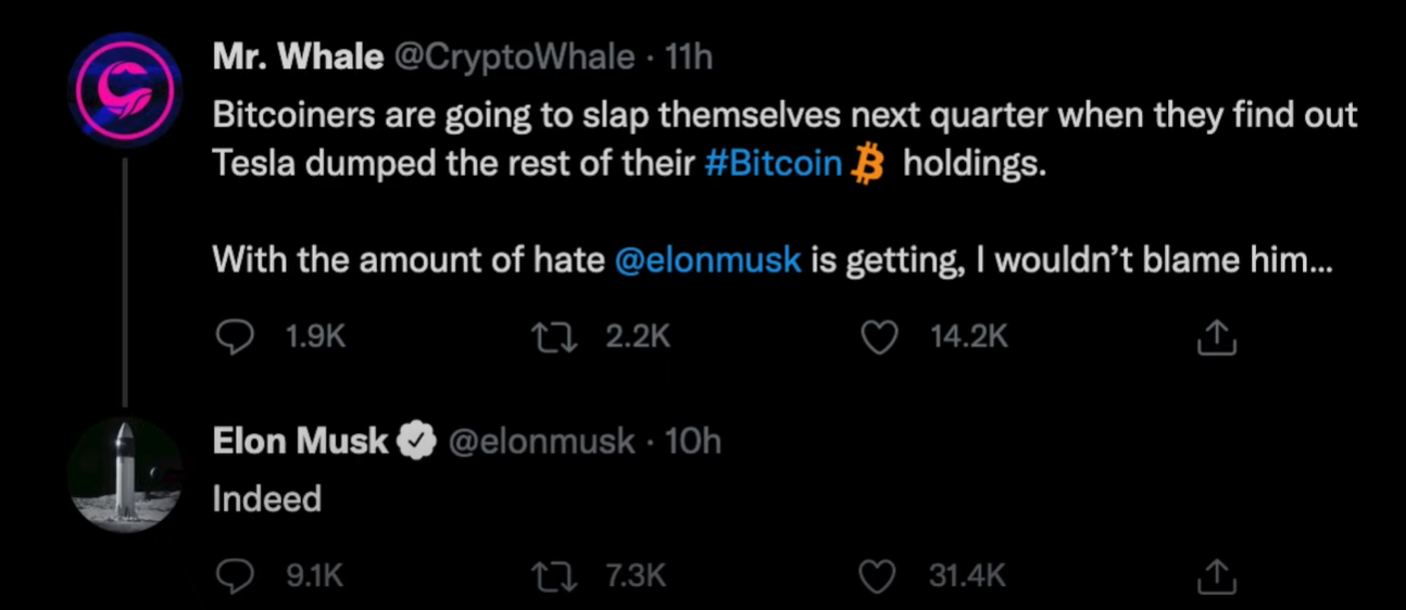 저번 주 갑작스럽게 비트코인으로 더 이상 테슬라의 차량을 구입할 수 없다고 폭탄선언을 하더니 다음날은 도지 코인으로 차량 구매는 어떤가?라는 트윗을 날리는 기행을 보여줬으며, 테슬라가 비트코인을 다 팔 것이냐는 트윗 질문에 "그럴 것이다."라고 답했다가 논란이 커지니 다음날 "테슬라는 비트코인을 하나도 팔지 않았다고 못 박았습니다."