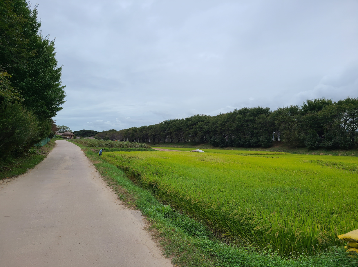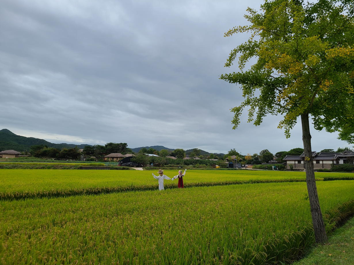 셔틀버스에서 내려서 안동 하회마을로 이동하는데 벼가 익어가고 멀리서 보이는 허수아비를 보니 뭔가 마음이 편해지는 느낌을 받았습니다.