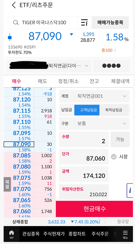 삼성증권 및 우리나라 퇴직연금 ETF는 위험자산 한도 70%라는 게 존재하여 관련 ETF를 사는데 납입금액의 70%를 넘어서지 못하게 되어있습니다.