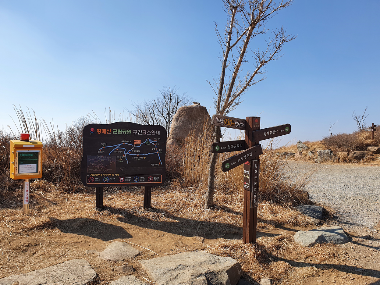 올라가다 보니 현재 어디 있는지 알려주는 표지판과 황매산 군립공원 구간 코스 안내 표지판도 볼 수 있습니다.