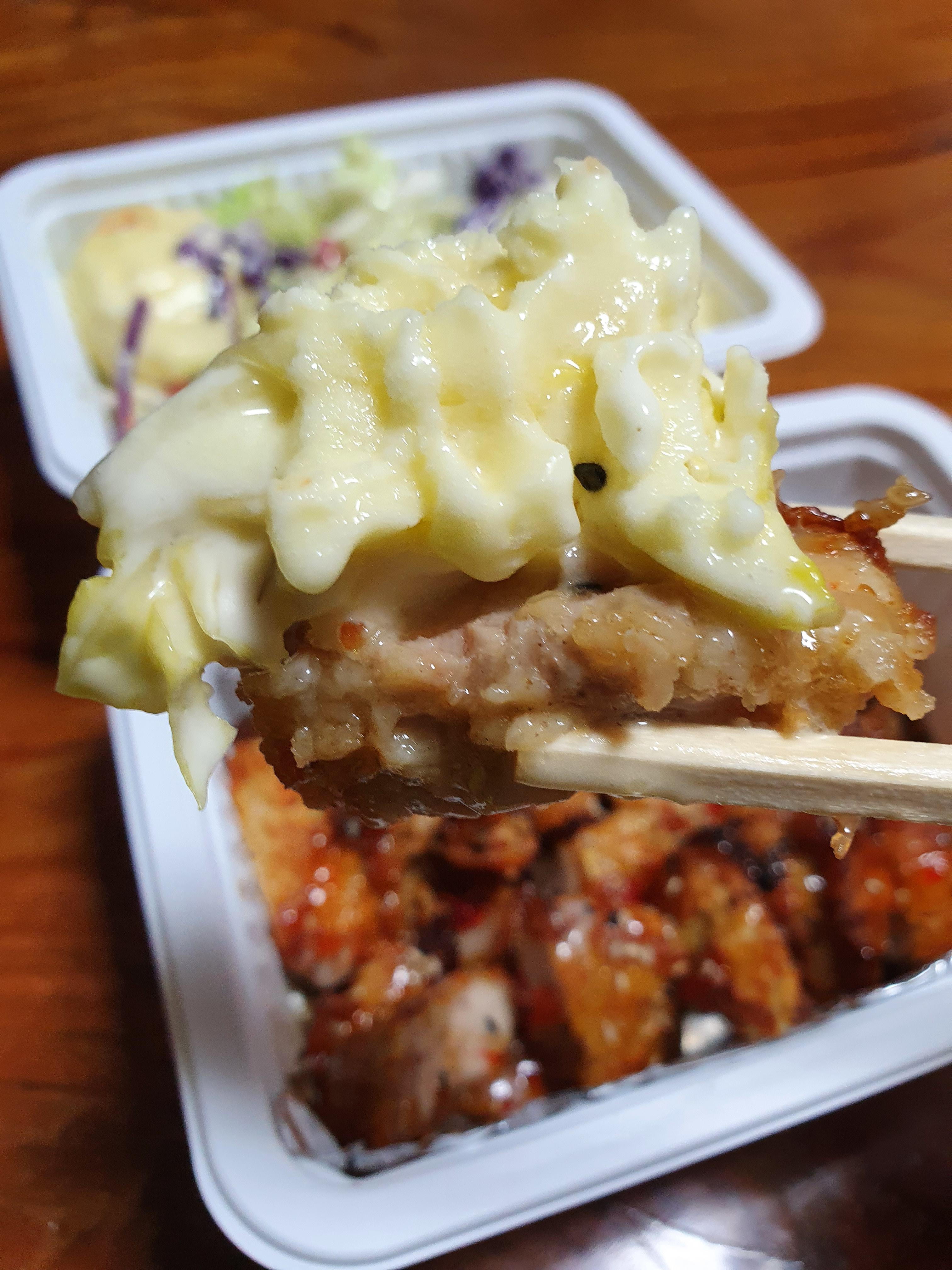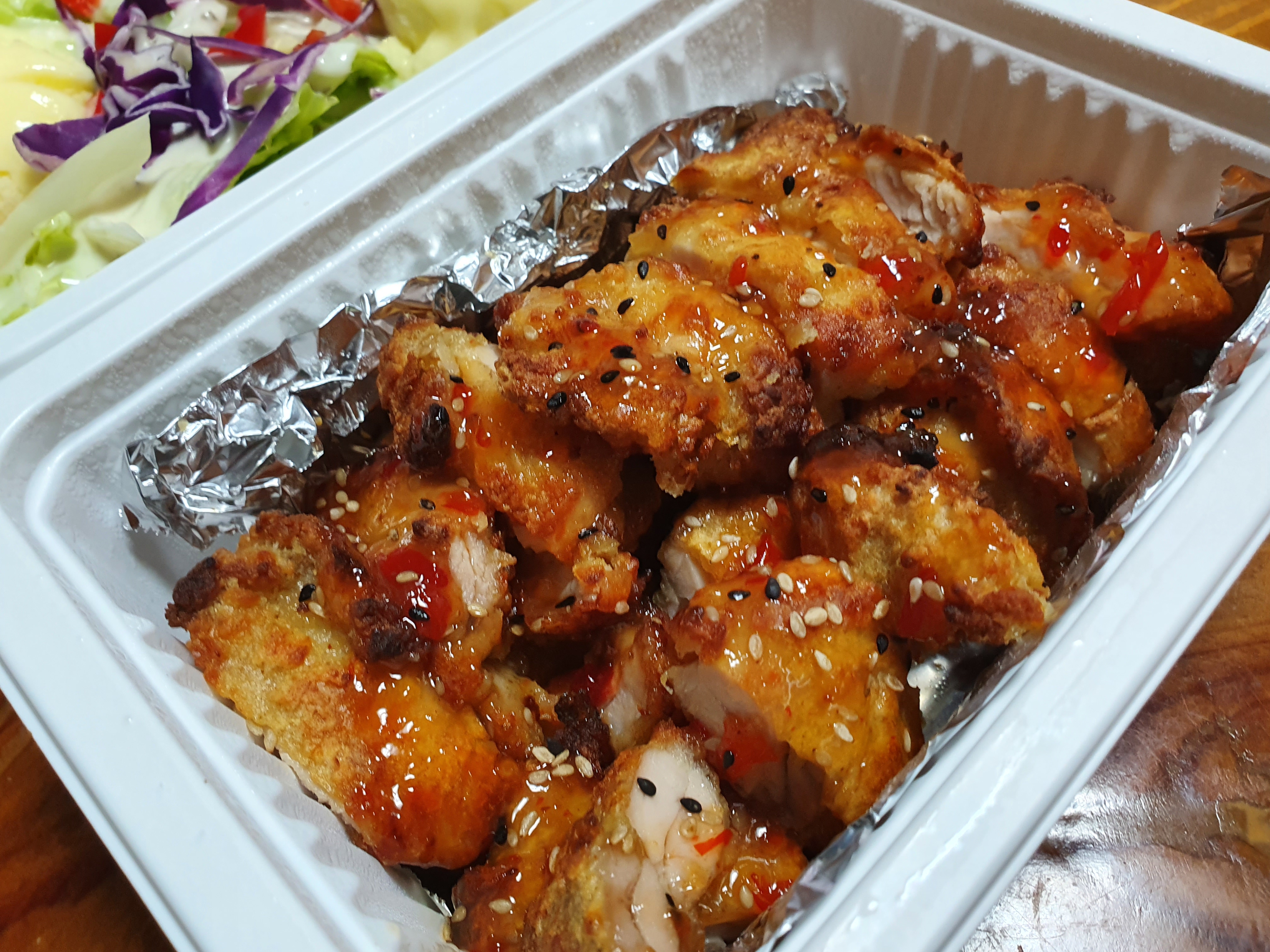 순살 치킨에 칠리소스를 듬뿍 뿌린 뒤에
