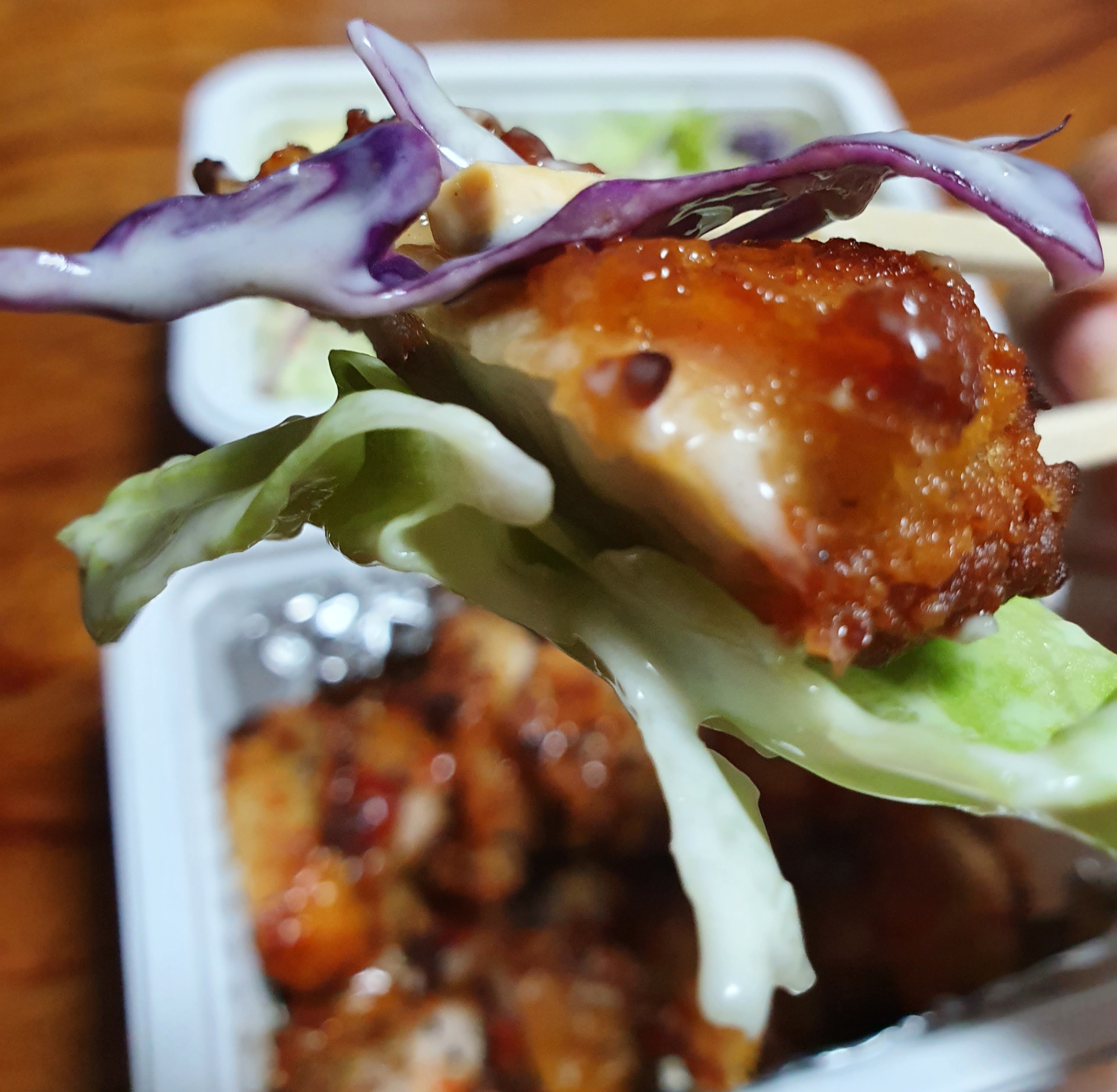 칠리소스 가득 묻은 치킨이 잘 어울려요