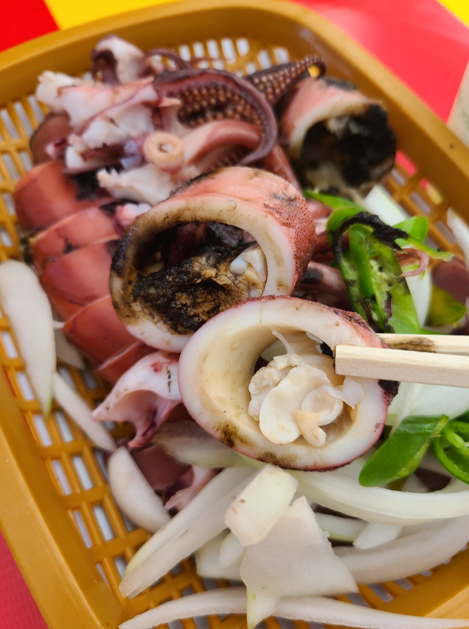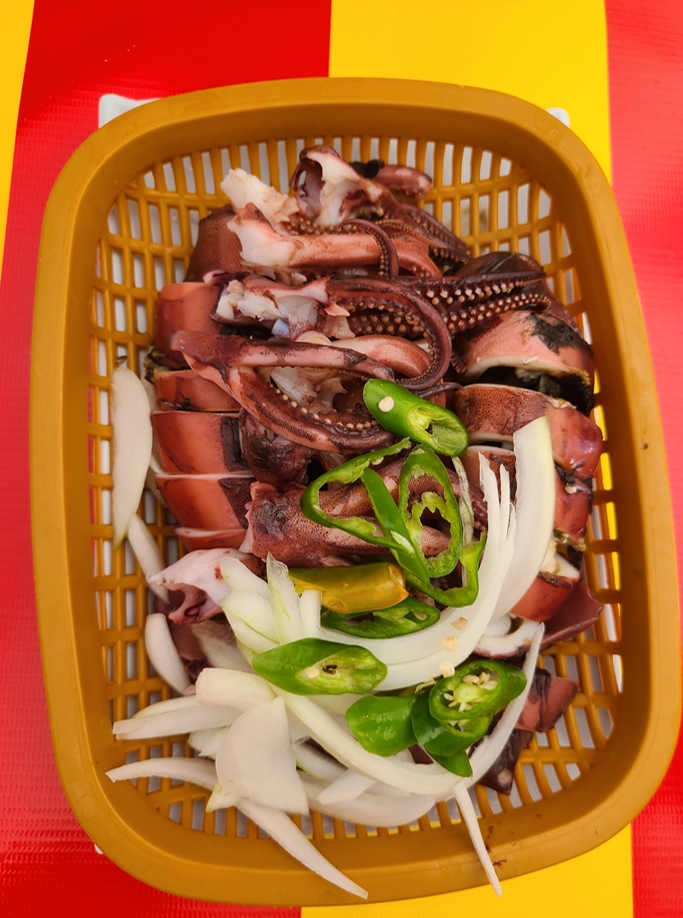 안에 내장과 먹물이 그대로 있는데 같이 먹으면 고소한 맛이 납니다. 맛에 민감하신 분들은 약간 비릴 수도 있으니 기호에 따라 내장을 제거하고 드시면 됩니다.