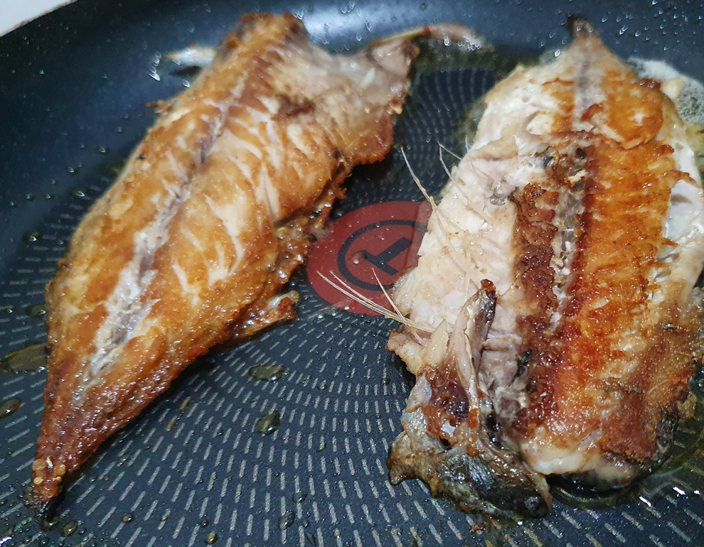 해동이 끝난 뒤 2팩을 뜯어 살짝 헹구고 등 쪽이 프라이팬에 향하도록 하고 중불에 서서히 구웠습니다.