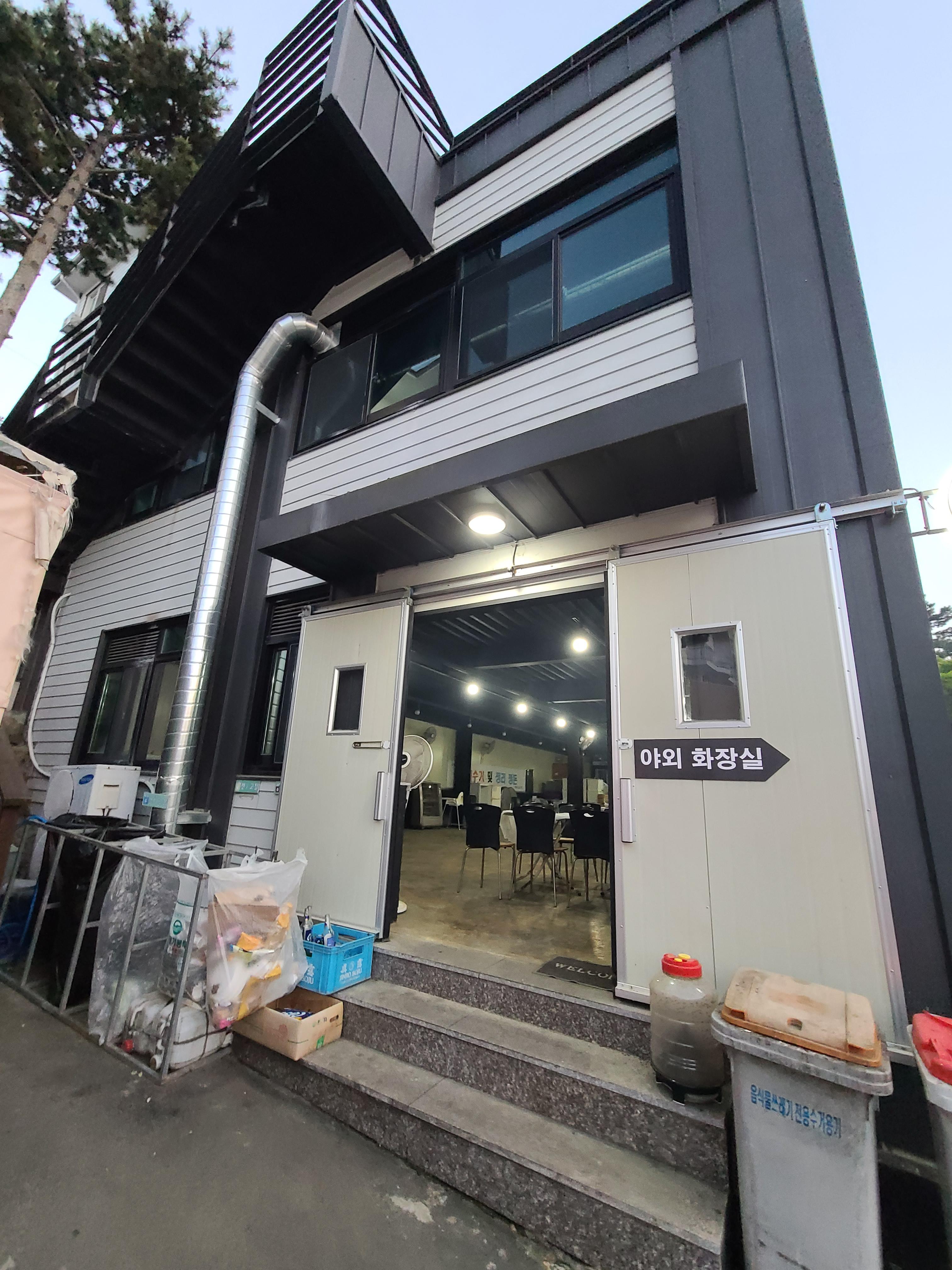 저희는 천막이 쳐진 야외 벤치에서 고기를 구워 먹었습니당~~