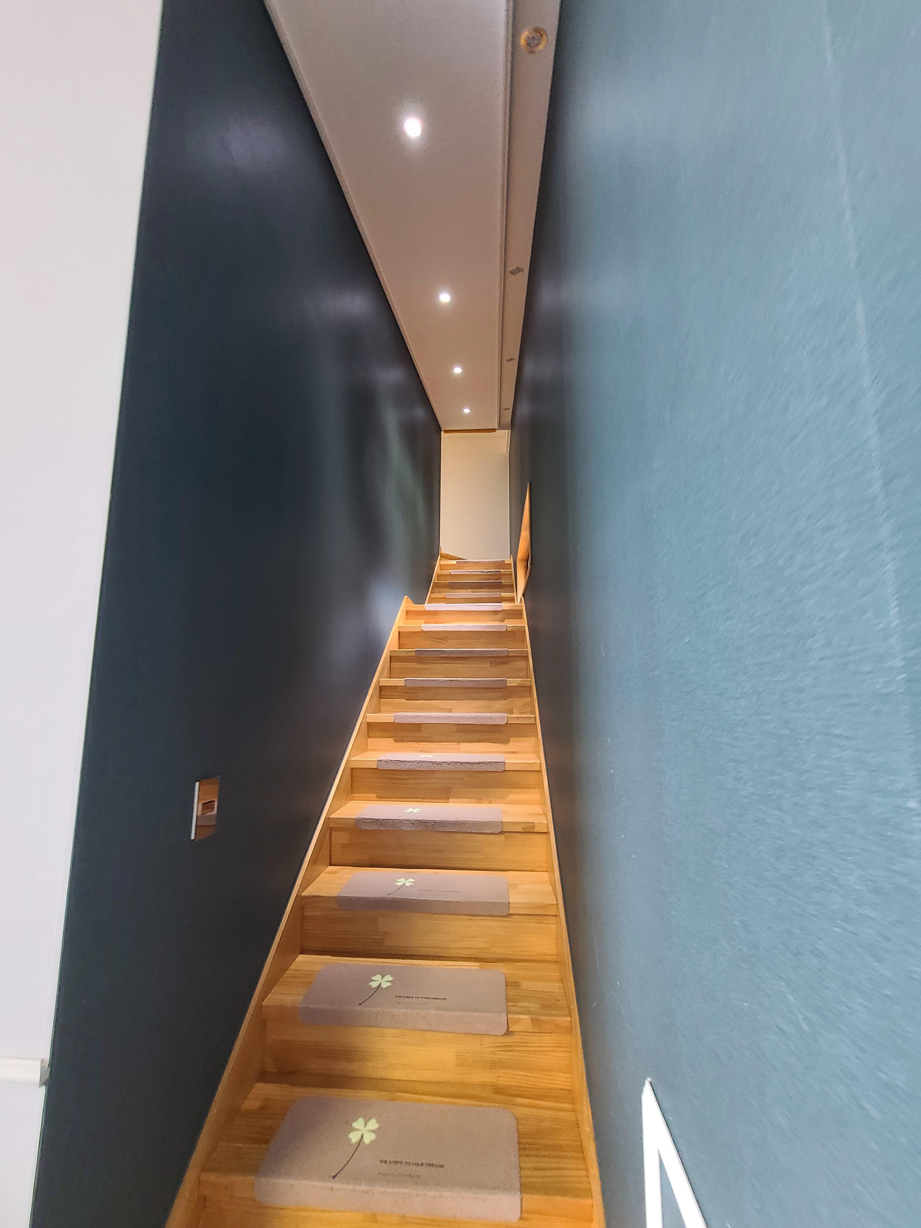 계단이 가파르지만 계단 폭이 넓고, 미끄럼 방지 매트도 깔려있어서 그나마 조금은 안전한 느낌입니다 ^^