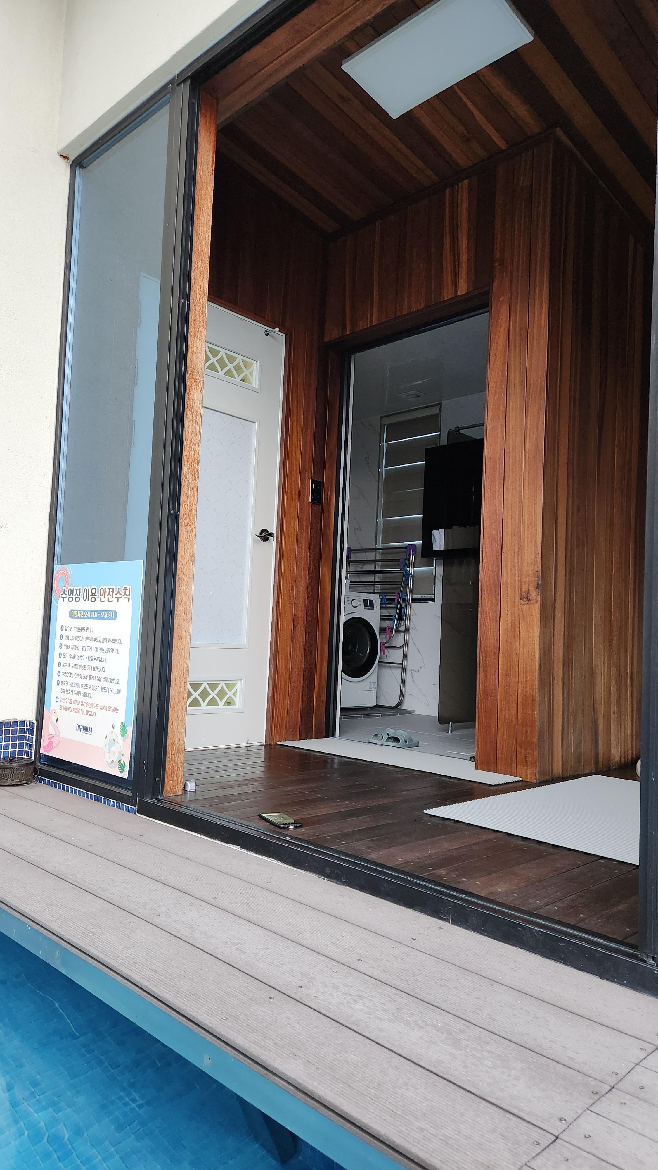 거실에서 수영장 가는 길에 간이 샤워실, 세탁실, 스파실이 있어요~