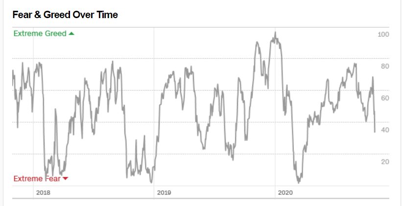 어제 하루만 Fear & Greed 지수가 20이나 떨어져 40 정도로 형성되어 있으며,