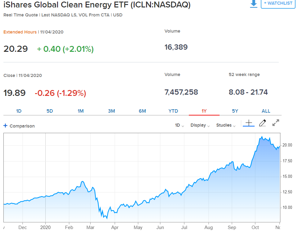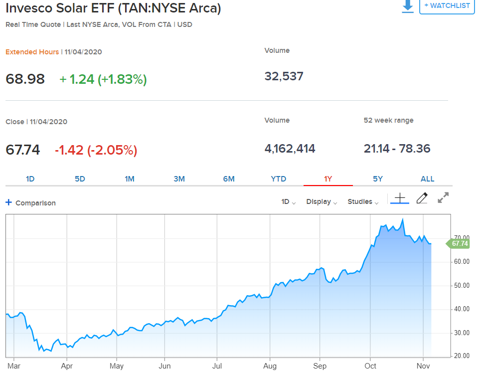 바이든 전형적인 테마주인 TAN(태양광 ETF) & ICLN(클린 에너지 ETF) 1.2~2.05% 정도