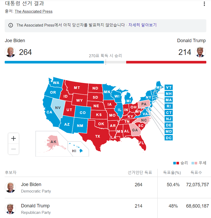 죠 바이든 후보가 270표 획득을 얼마 안 남기고 승리를 거의 거머쥔 상황이었습니다.
