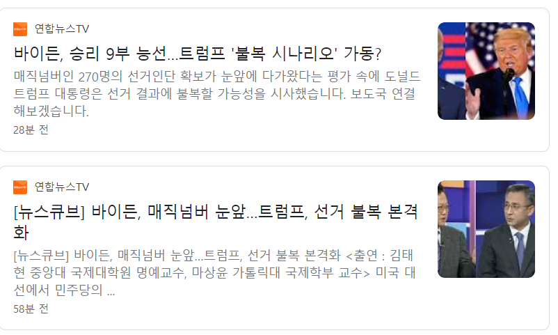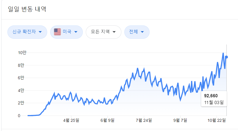 트럼프의 대통령 선거에 대한 불복 선언 & 코로나-19 신규 확진이라는 복병이 남아있습니다.