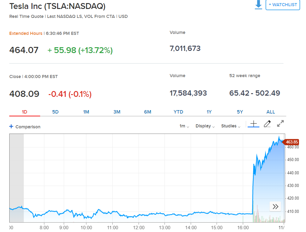 현재 시간(한국) 8시 31분 약 14%가 폭등하여 현재 464달러네요 ^^