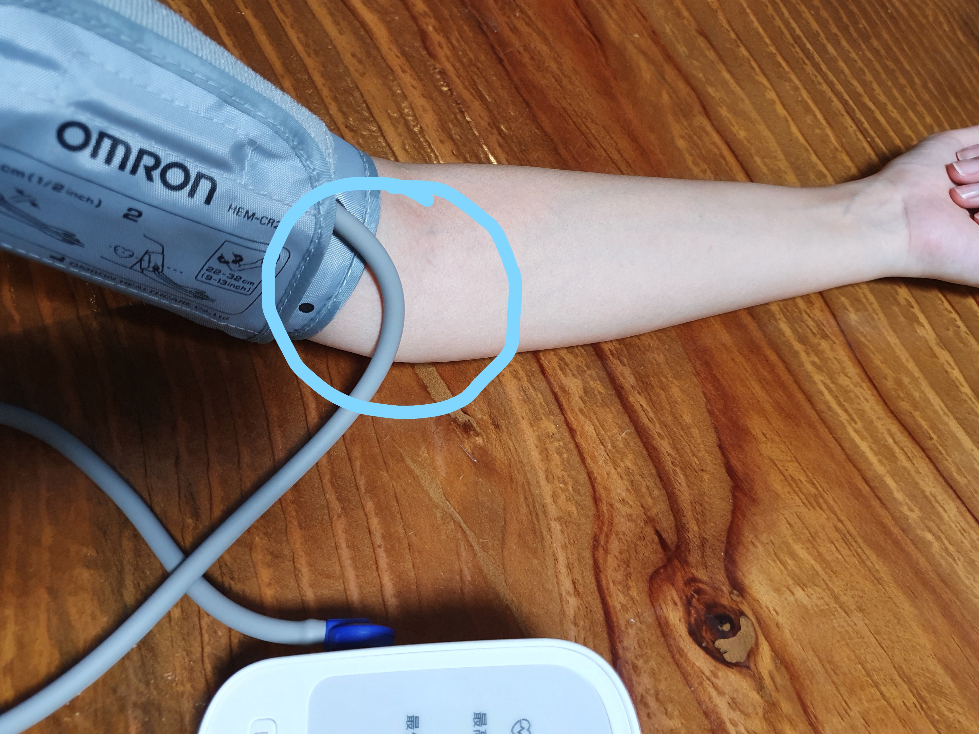 그 부분과 혈압계 동그라미 안의 ●, ▼표시가 있는 곳이 사진처럼 같은 방향에 있어야