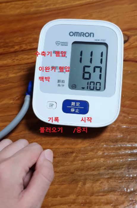 혈압계를 다 착용하고나면, 파란색 버튼을 누르면 혈압이 측정완료된다.