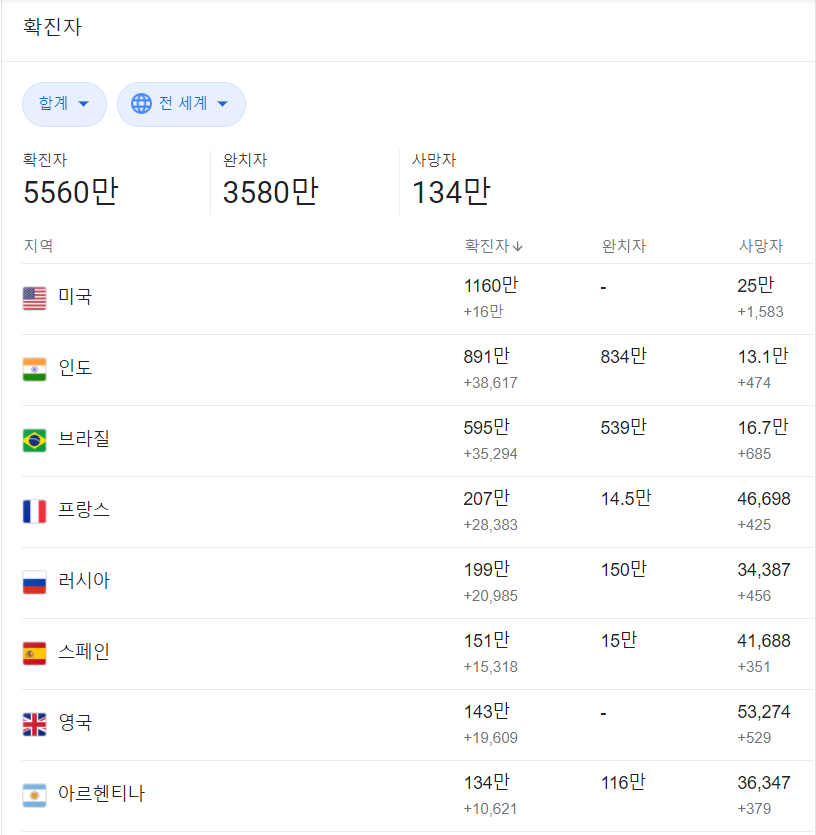 현재 전 세계 코로나-19 확진자는 5560만 명이며 미국만 신규 확진자가 16만 명에