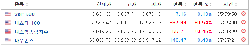 기대감이 합쳐지며, 기술주 중심의 나스닥만 홀로 0.5% 정도 상승하였습니다.