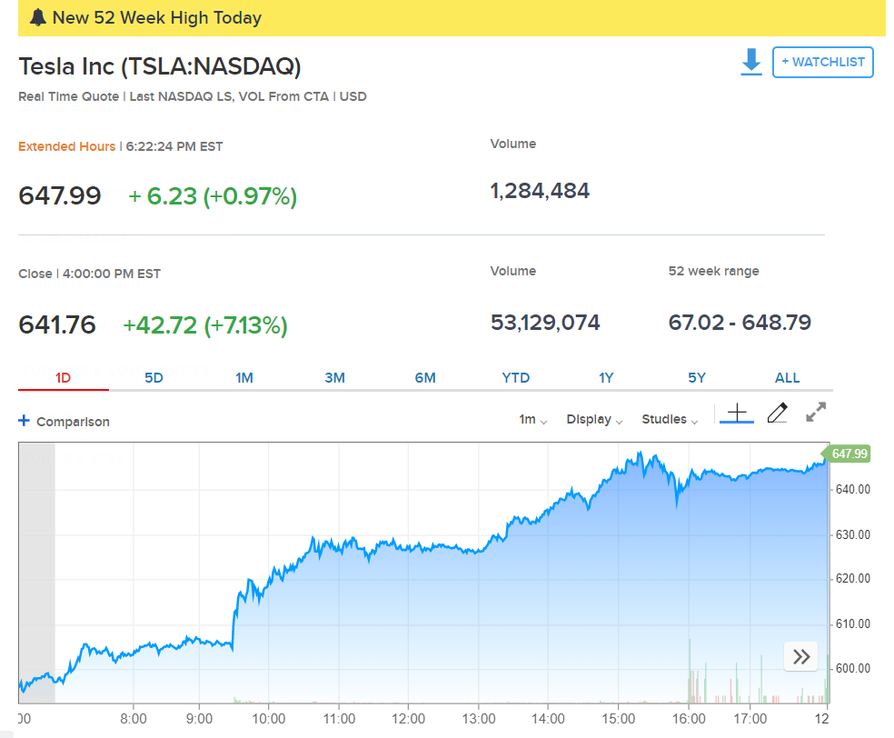 현재 Tesla가 장중 7% 정도 급등했습니다.