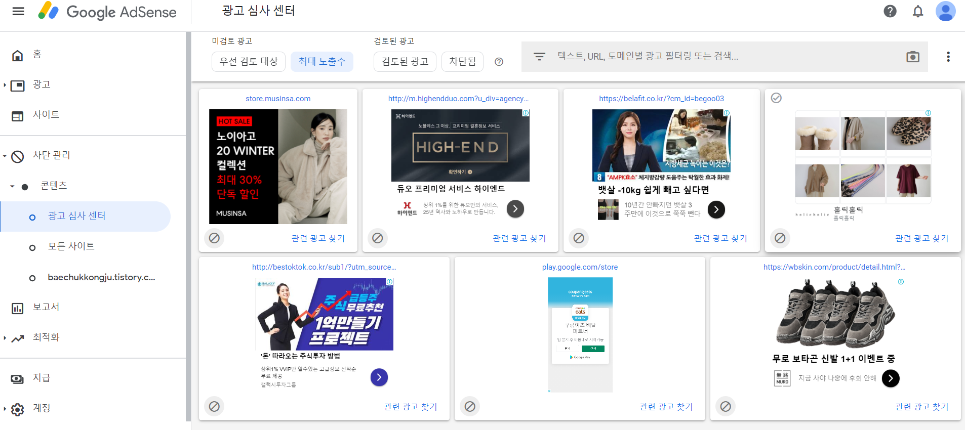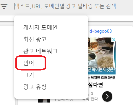 그러면 아래의 스샷처럼 한국어를 제외한 저의 티스토리 블로그에 게재가 될 수도 있는 가능성을 가진 광고들을