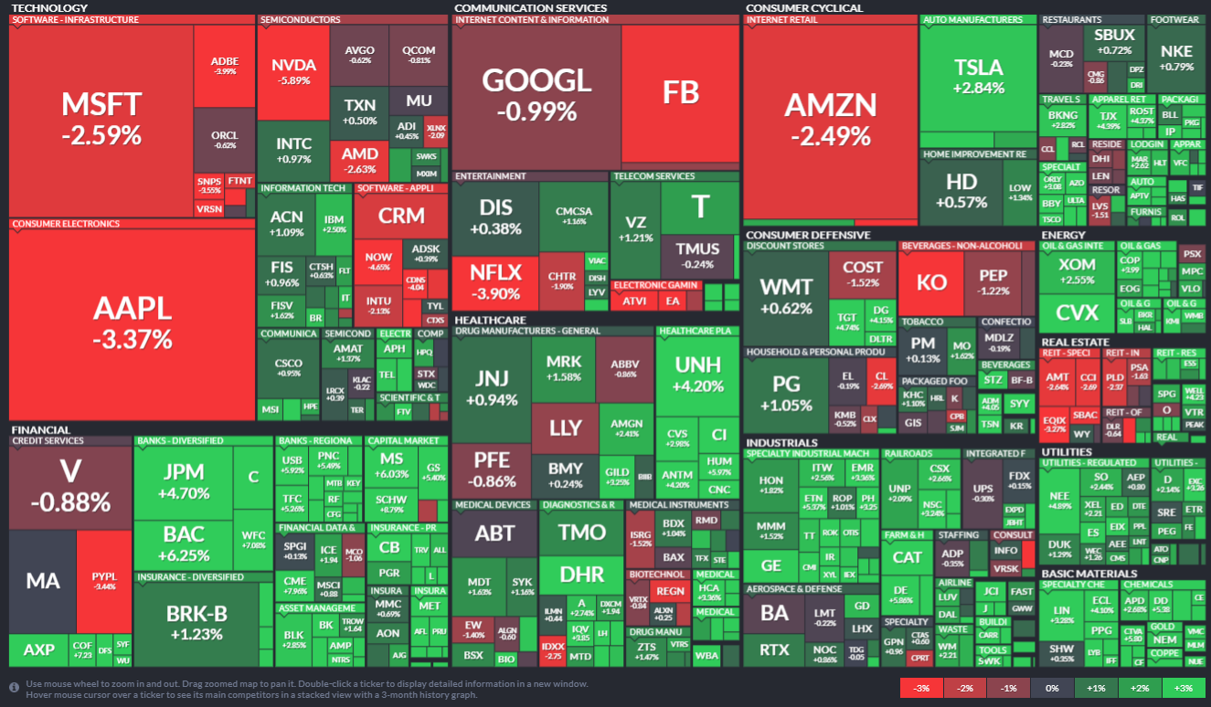 결국 이러한 결과가 증시에 반영되어 대형 기술주들이 폭락하고 바이든 테마주 & 중소형 기술주 등은 상승하는