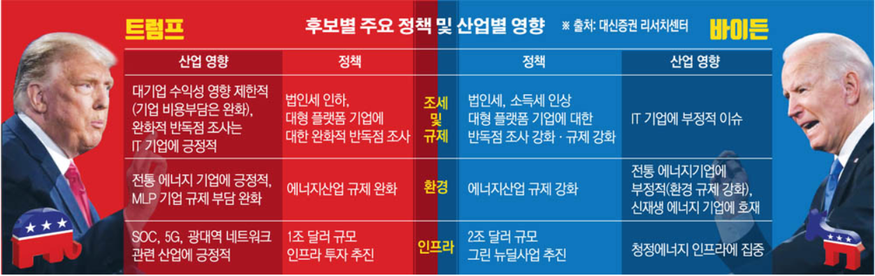 코로나 팬데믹으로 인해 기진맥진한 경제를 ‘정부의 손’으로 되살리기 위해 트럼프보다 훨씬 큰 규모의 돈을 직접 뿌릴 가능성이 크다고 봅니다. 바이든은 조지아주 결선투표 지원 유세 때 “1월 중 추가적인 초대형 경기부양책을 통해 국민들에게 2000달러씩 보내겠다고 하였으며, 취임 즉시 2조, 혹은 3조 달러 규모의 초대형 지원 패키지를 추진하겠다”라고 약속한 상태입니다.