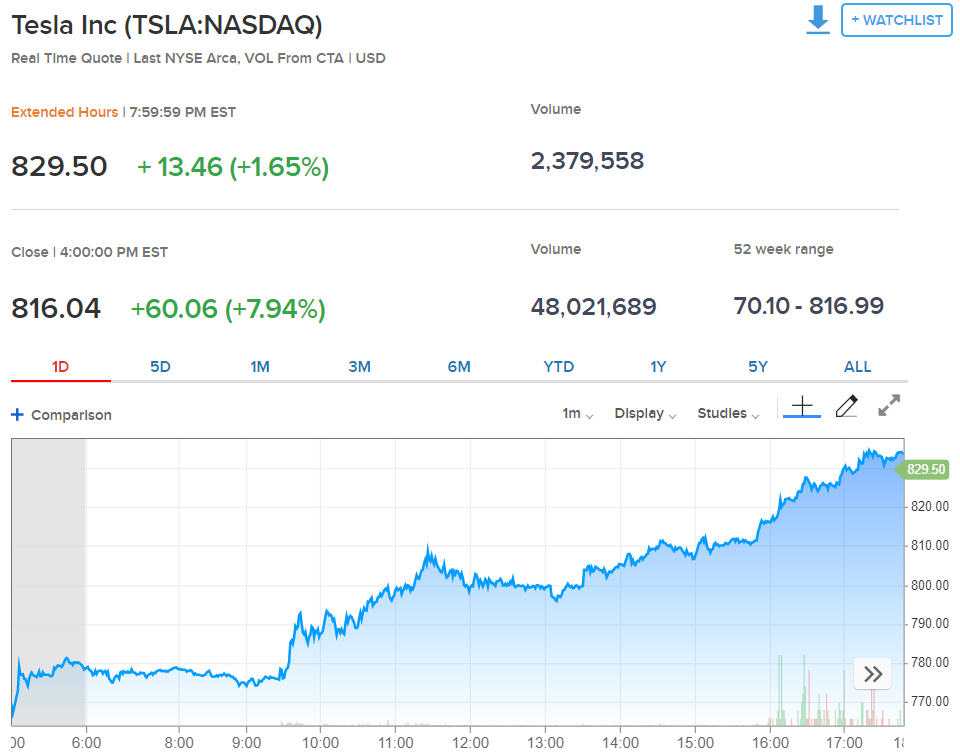 바이든 관련주로 오늘 엄청난 상승을 했는데 특히 테슬라는 7.9% 이상 상승하였고 장 마감 후