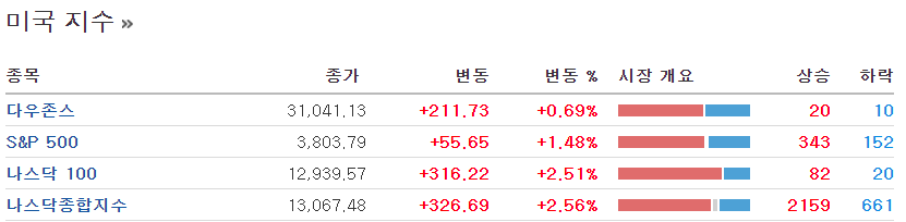 오늘 3대 지수 모두 엄청나게 상승하면서 모두 최고치를 갈아치웠습니다.