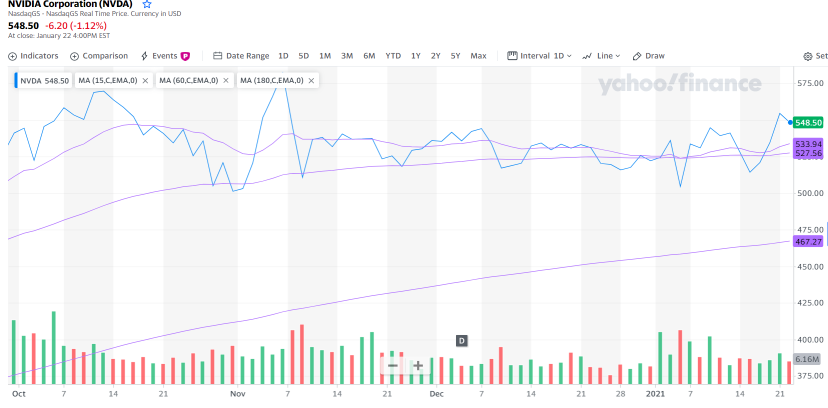 엔비디아도 계속 횡보 중이고 전기차 시장도 커지고 반도체 및 그래픽 카드의 수요가 계속 커질 거라고 판단하였습니다. 주가 또한 매력적이라고 판단하여 521달러일 때 2주를 매수했었는데요.