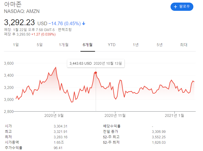 그러나 아직 둘 다 전 고점은 뚫지 못 한상 태이고 아마존 같은 경우 전 고점의 5% 이상 하락한 상태입니다.