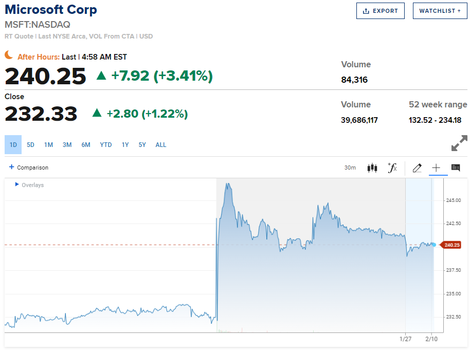 실적 발표 이후 마이크로소프트 주가는 전 고점을 뚫고 실적 발표 이후 시간외에서 3.4% 더 추가 상승했습니다.
