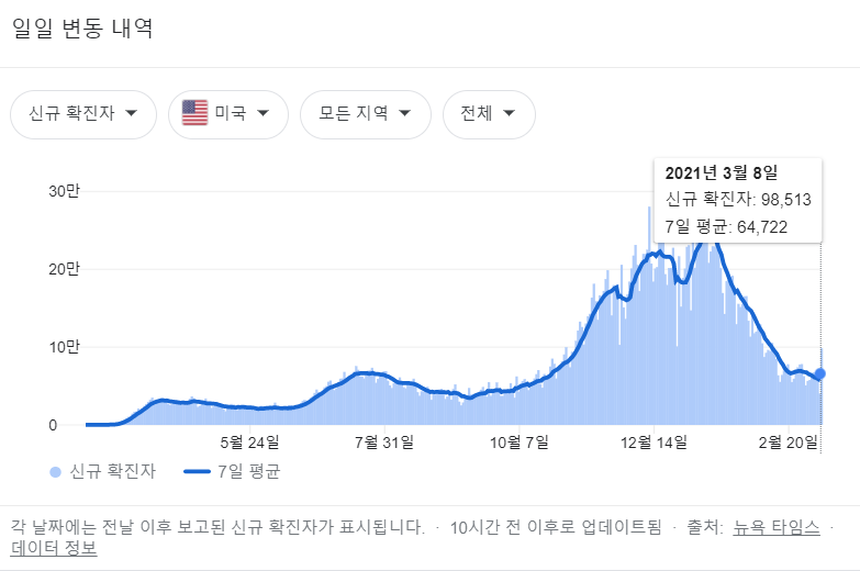 현재 미증시는 거대한 부양책을 이제 있는 그대로 호재로 보기보다는 그 부양책으로 인한 인플레이션을 우려하며, 연준에서 생각보다 빠르게 테이퍼링을 하지 않을까? 하는 걱정과 금리인상으로 인한 기술주들의 약세와 지금까지 코로나-19로 인해 주가가 많이 하락한 경기 민감주로 자금 이동 등을 걱정합니다.