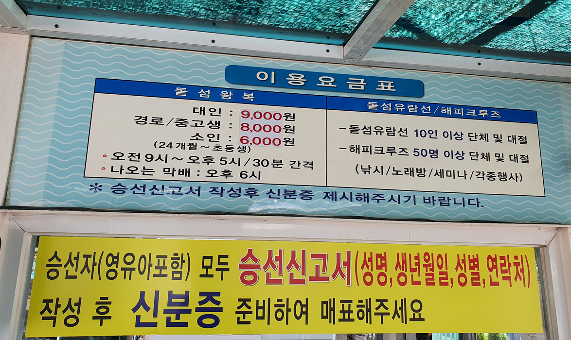 현장에서 직접 돝섬 왕복표를 사려면 대인은 9000원 소인은 6000원이네요.