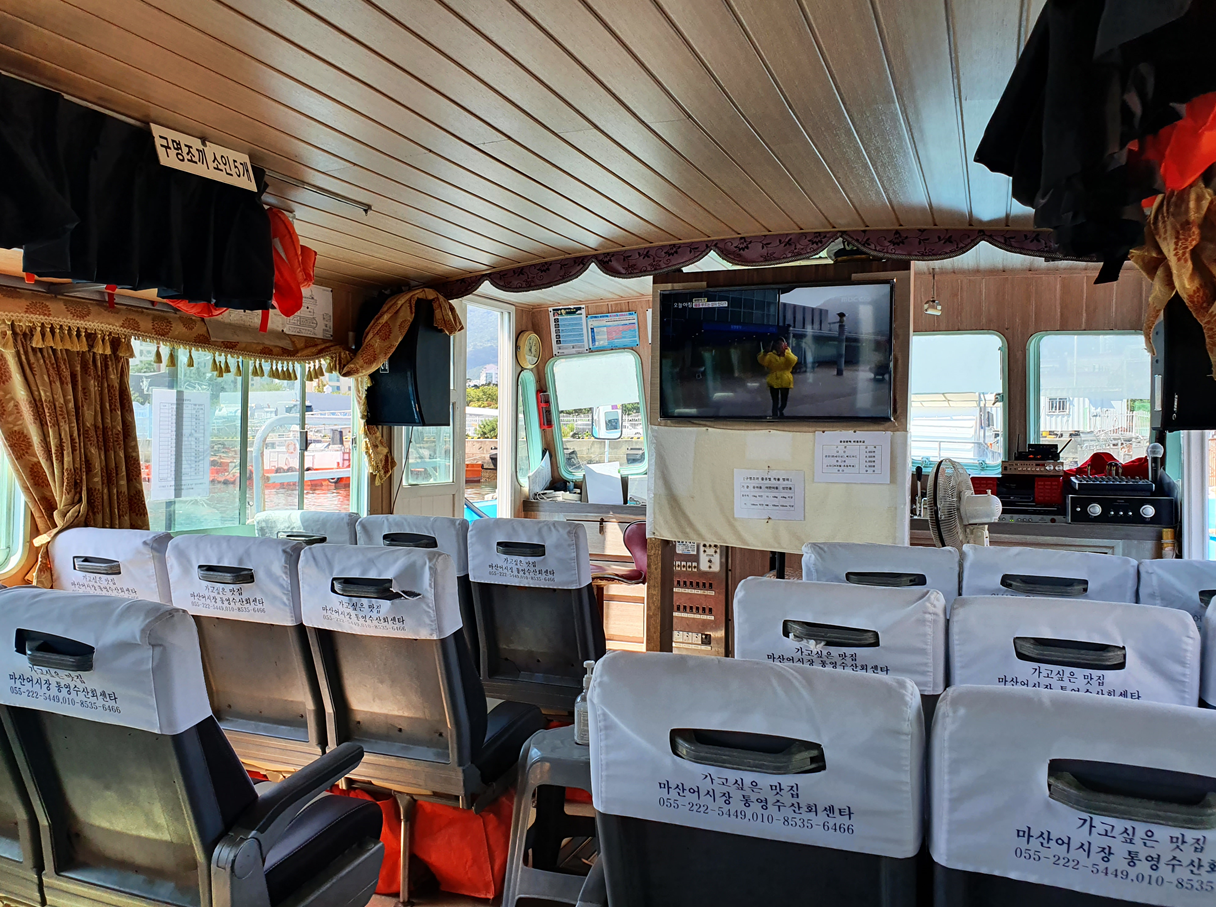 배의 앞쪽은 등받이 의자들이 준비되어 있고 뒤편은 서있는 공간과 함께 걸터앉을 수 있는 공간이 있습니다.