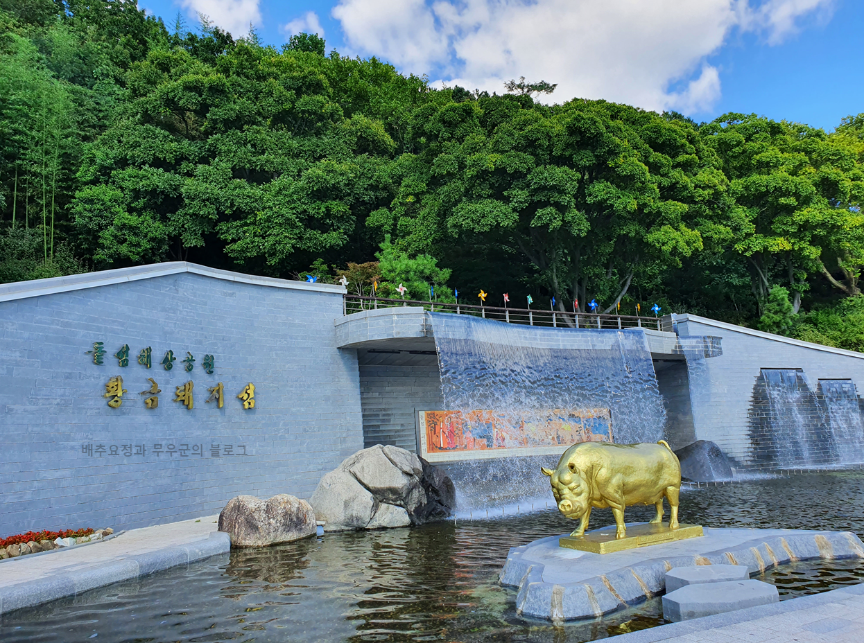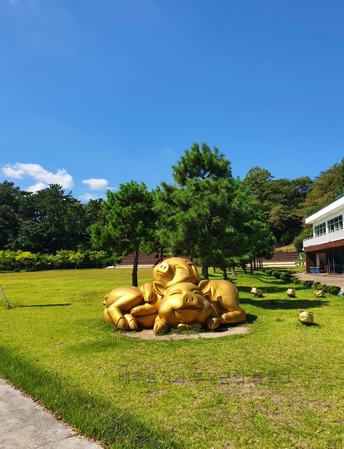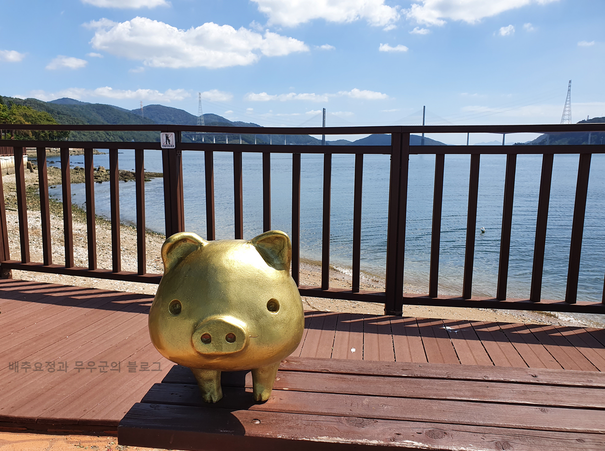 그리고 쉼터 옆에는 돝섬에서 가장 유명한 거대 황금돼지상이 있는데요.
