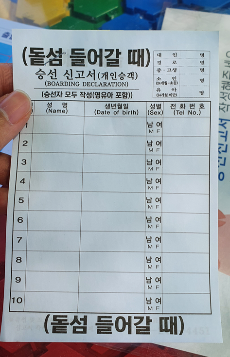 승선자는 모두~ 작성해주시고 신분증과 함께 보여주셔야 표가 발급됩니다.
